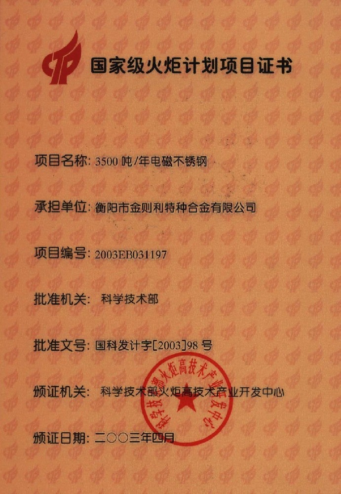 國家級(jí)火炬計(jì)劃項(xiàng)目證書 |